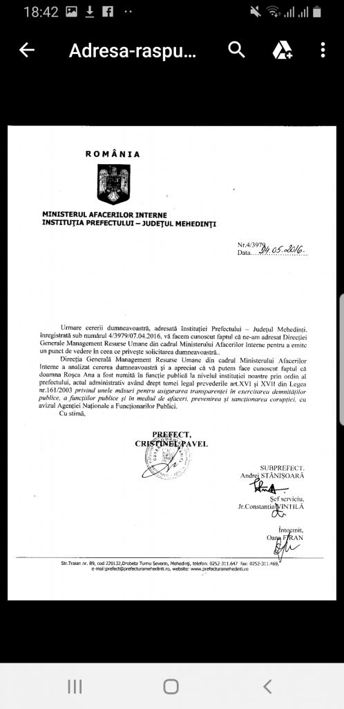 ,,Pe 23 martie, ziariști au adresat prin e-mail Instituţiei Prefectului Judeţului Mehedinţi o solicitare în baza Legii nr. 544/2001, întrebând când a avut loc concursul prin care Anei Roşca i-a fost schimbată încadrarea din personal contractual în funcţionar public al Prefecturii.