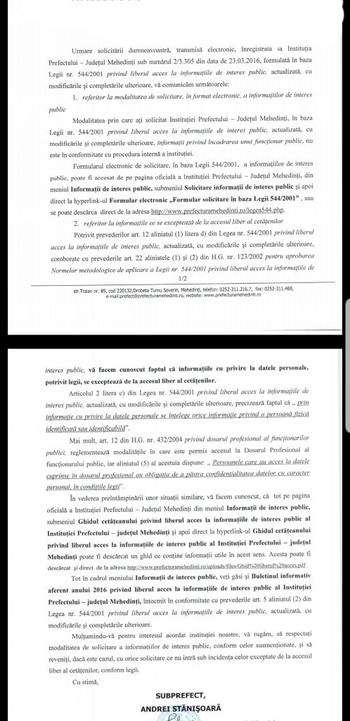 Pe 25 martie, a fost emis un răspuns al Prefecturii Mehedinţi, care a ajuns la redacției pe 7 aprilie, dintr-o eroare tehnică a Ministerului Afacerilor Interne (instituţie prin care Prefectura ne-a trimis răspunsul). Prefectului înştiinţa nici mai mult, nici mai puţin decât că nu se respectă protocolul şi nu se folosește formularul on-line disponibil pe site-ul instituţiei. Ba mai mult: autorităţile dădeau de înţeles că subiectul solicitării ziariștilor intra în categoria datelor personale, care „se exceptează de la accesul liber al cetăţenilor”. Ca şi cum nu ar fi fost de ajuns, aceeaşi instituţie menţiona că „persoanele care au acces la datele cuprinse în dosarul profesional au obligaţia de a păstra confidenţialitatea datelor cu caracter personal, în condiţiile legii”.