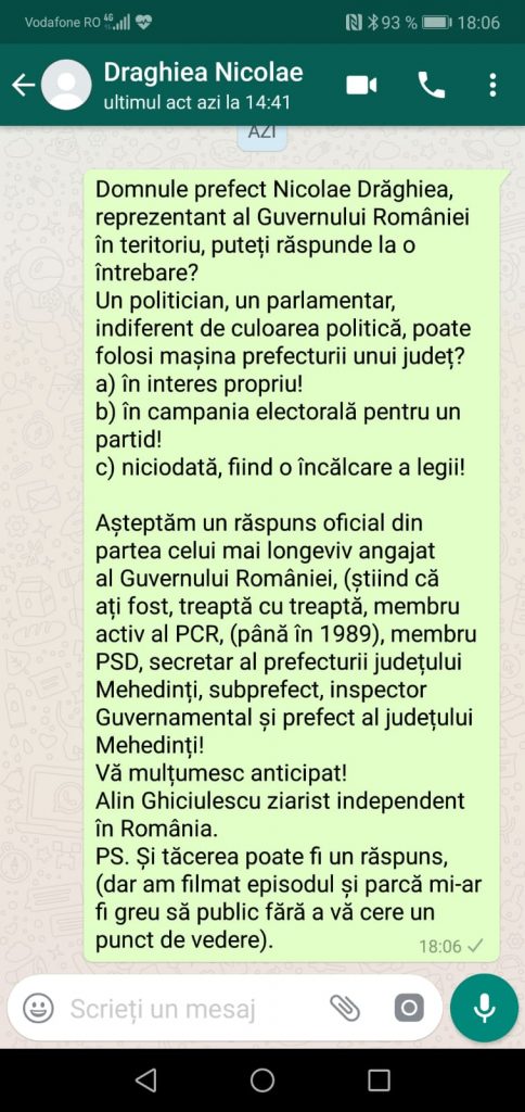 ,,Practic atunci când vreau să scriu ceva de Drăghia și clanul său, orice lider politic mi-ar oferi orice numai să nu o fac, și să afle prefectului cine a intervenit să nu continuui anchetele…Să primească,, îngăduință,, la rezultatul final al votului!”, precizeaza jurnalistul Alin Ghiciulescu.