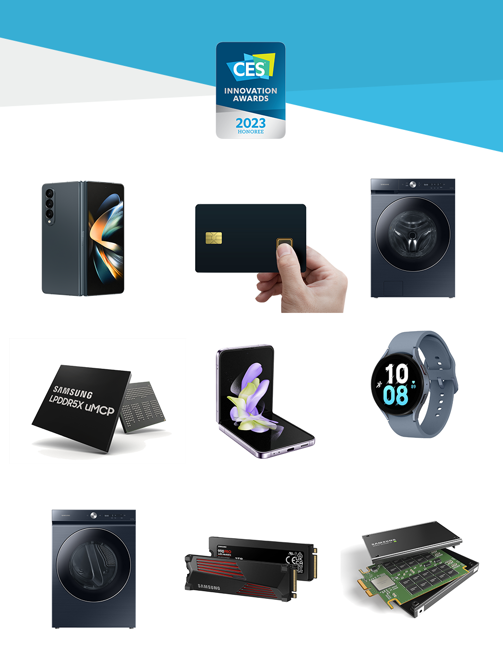 Produsele Samsung au fost premiate pentru inovație în categoriile Digital Imaging/Photography, Mobile Devices & Accessories, Gaming, Digital Health, Wearable Technologies, Video Displays, Home AV Components & Accessories și Software & Mobile Apps. O parte din aceste produse premiate încorporează caracteristici ecologice, precum Galaxy Z Flip4 și Galaxy Z Fold4, care sunt realizate din materialele plaselor de pescuit reutilizate și au ambalajul confecționat din hârtie 100% reciclată. Compania a primit, de asemenea, prestigiosul premiu ‘Best of Innovation Honoree’ pentru categoriile Computer Peripherals & Accessories, Video Displays și Cybersecurity & Personal Privacy.