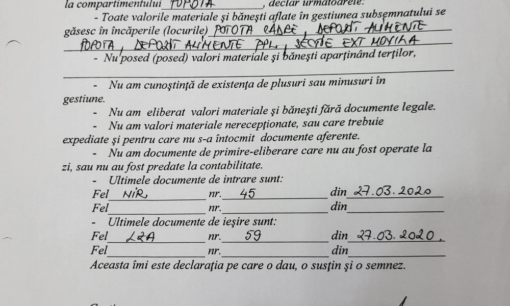 „Mentionez ca la data de 23.03.2020, comisia de inventariere NU a inventariat obiectele de inventar eu am semnat lista in necunostinta de cauza (crezand ca lista cu alimente e in dublu exemplar)”.