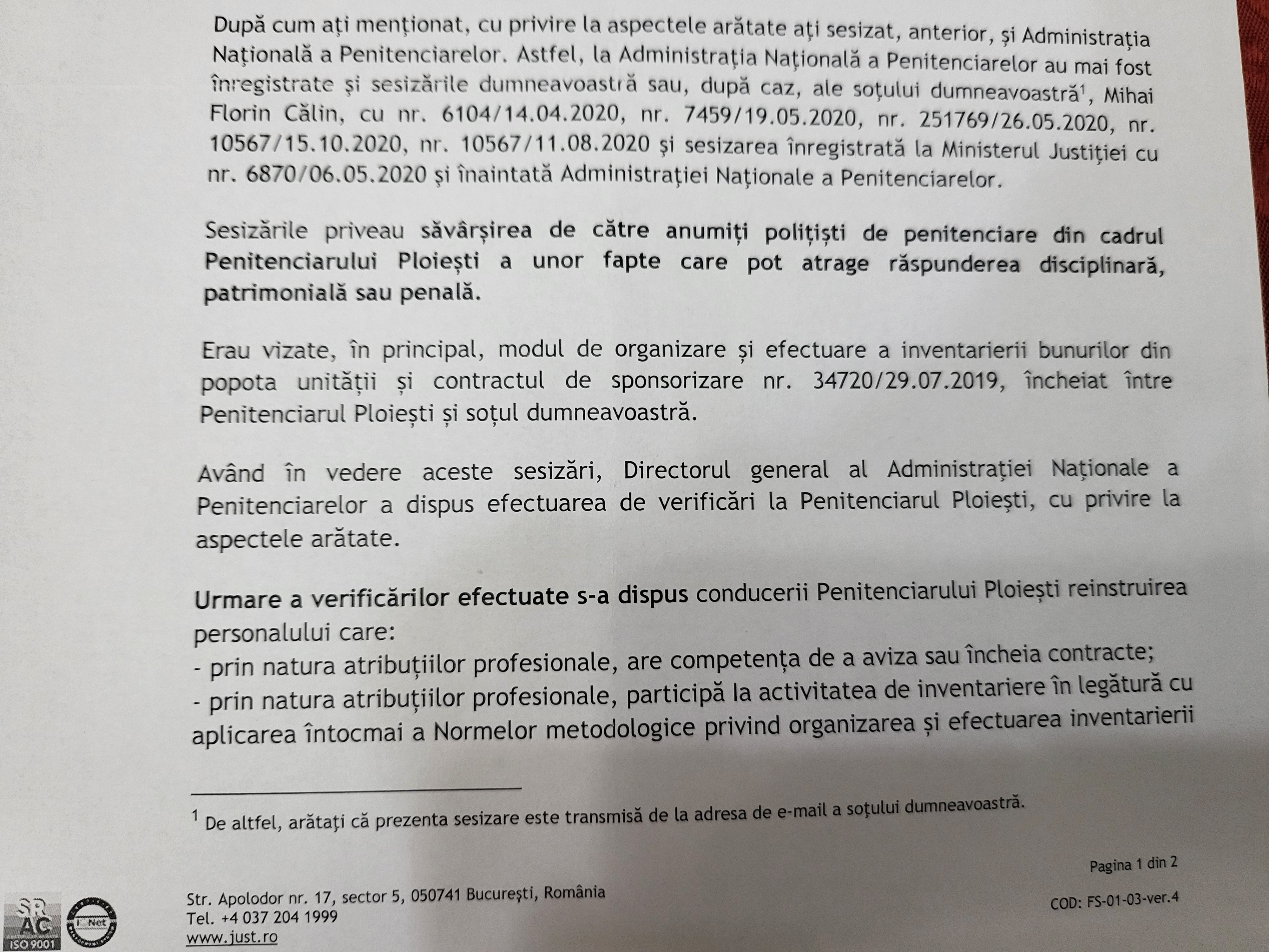Asa cum dezvaluiam, prin Nota de Constatare nr 6104/6870/7459/05.06.2020, D.I.P (Directia Inspectie Penitenciara), sub semnaturile comisarilor Marian Popescu, Roxana Ionita si aprobat de actualul consilier al Ministrului Justitiei, Ungureanu Tiberiu (care la aceea data era seful Directiei) se constata o serie de ilegalitati cu conotatii penale si in loc sa se sesizeze organele de cercetare penala pentru furturile si falsurile depistate propun o serie de masuri, printre care sesizarea comisiei de disciplina din cadrul MJ impotriva lui Constantin Brazan (directorul Unitatii la aceea data), Valentin Matei, director adjunct la aceea data.