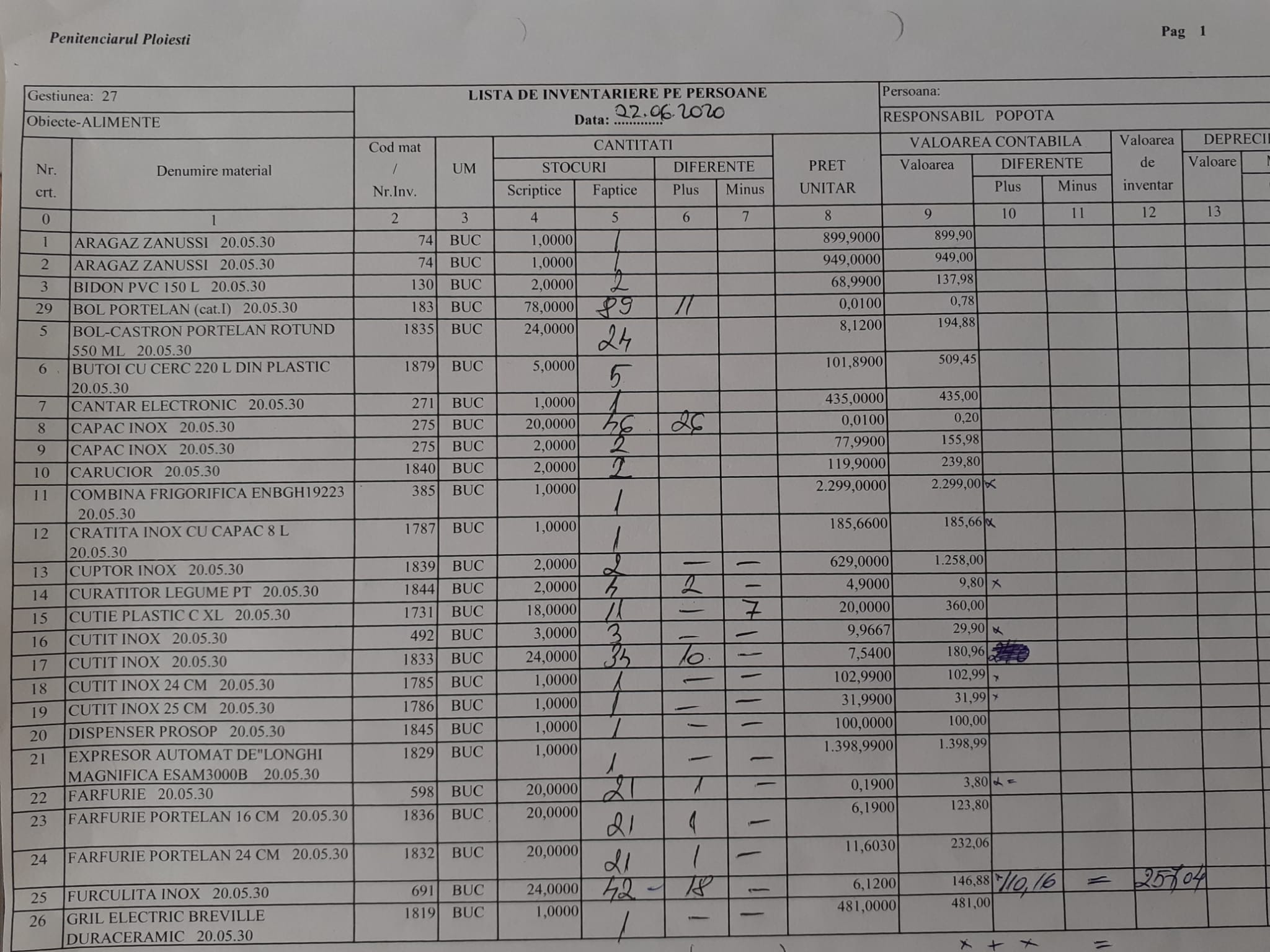 - La inventarierea lui Polifrone , acesta vine cu alte Liste de inventariere privind gestiunea Popotă din contabilitate , respectiv Gestiunea 27 Alimente –responsabil Popotă. Pe aceste liste ,,Logic” nu se găsește serviciul de masă de 119,90 lei!!!