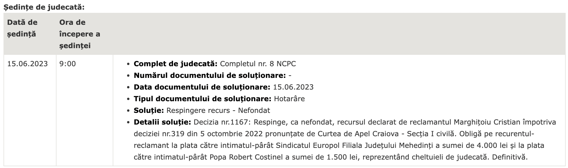 După soluția firească a unei astfel de plângeri penale, artificial create, cms. șef Marghitoiu a deschis acțiune în răspundere civilă delictuală. A chemat în judecată personal pe politistul Robert Popa dar și Sindicatul EUROPOL, în cuprinsul cererii a cerut, nici mai mult, nici mai puțin decât 100.000 euro. Cms. șef Marghitoiu a susținut că a suferit puternice traume psihice, că ulterior postării și-a pierdut autoritatea în fața subalternilor, că a fost subiectul unor glume și alte asemenea suferințe de ordin psihologic. Cu alte cuvinte, traumele nu erau generate de prestația slabă la concurs, ci de faptul că sindicatul Europol i-a făcut publică nota care oricum trebuie afișată, conform art. 20 alin. 1 lit. e din Anexa 3 din Ordinul 140/2016 privind activitatea de management resurse umane în unitățile de poliție ale Ministerului Afacerilor Interne.