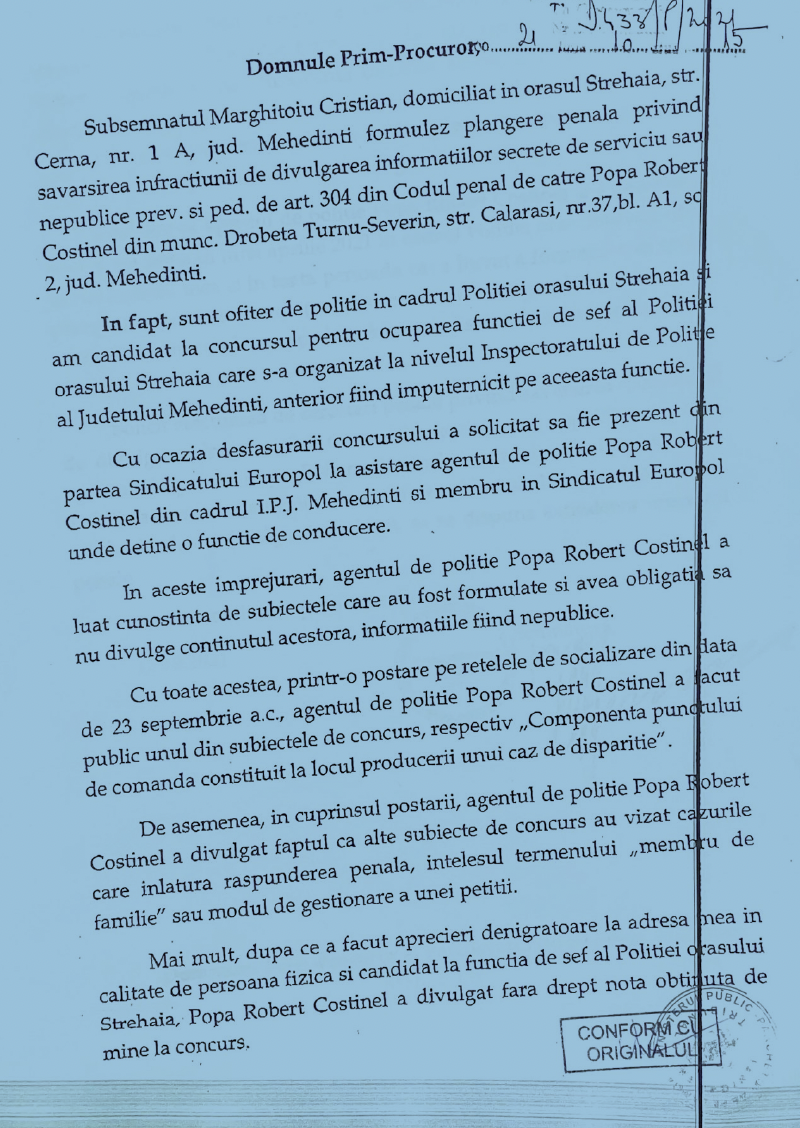 Rănit în orgoliu, ca urmare a rușinii generate de nota obținută și răspunsurile oferite la întrebările elementare pe linie profesională, primul imbold al cms. șef Marghitoiu a fost să îl intimideze pe reprezentantul Sindicatului EUROPOL care a participat ca observator la concurs, respectiv pe agentul principal Robert Popa, prin depunerea unei plângeri penale pe care dacă o parcurgeți, aveți impresia că au fost divulgate informații de interes național ce pun în pericol securitatea României.