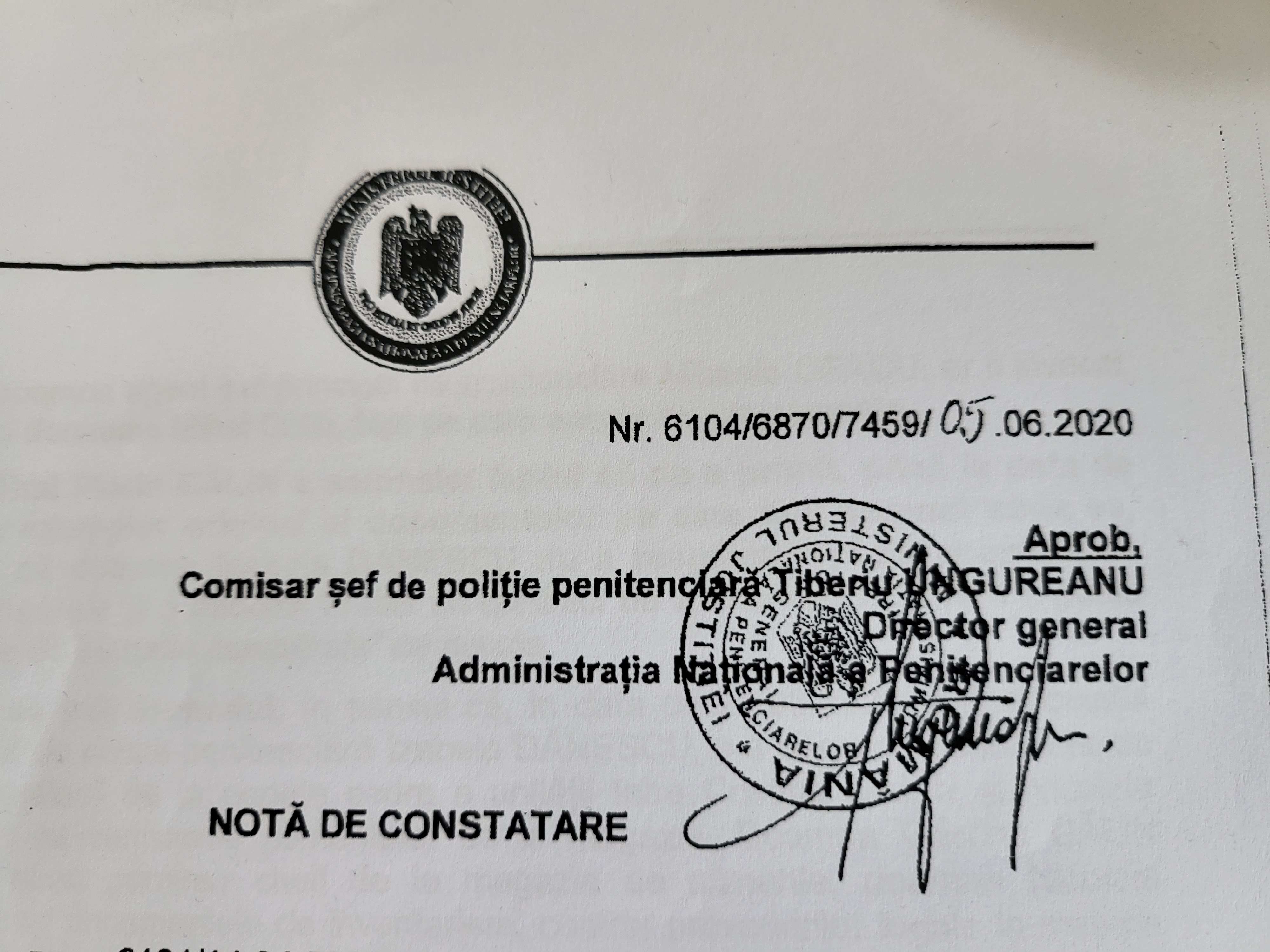 Prin Nota de Constatare nr 6104/6870/7459/05.06.2020, D.I.P (Directia Inspectie Penitenciara), sub semnaturile comisarilor Marian Popescu, Roxana Ionita si aprobat de actualul consilier al Ministrului Justitiei, Ungureanu Tiberiu (care la aceea data era seful Directiei) se constata o serie de ilegalitati cu conotatii penale si in loc sa se sesizeze organele de cercetare penala pentru furturile si falsurile depistate propun o serie de masuri, printre care sesizarea comisiei de disciplina din cadrul MJ impotriva lui Constantin Brazan (directorul Unitatii la aceea data), Valentin Matei, director adjunct la aceea data.