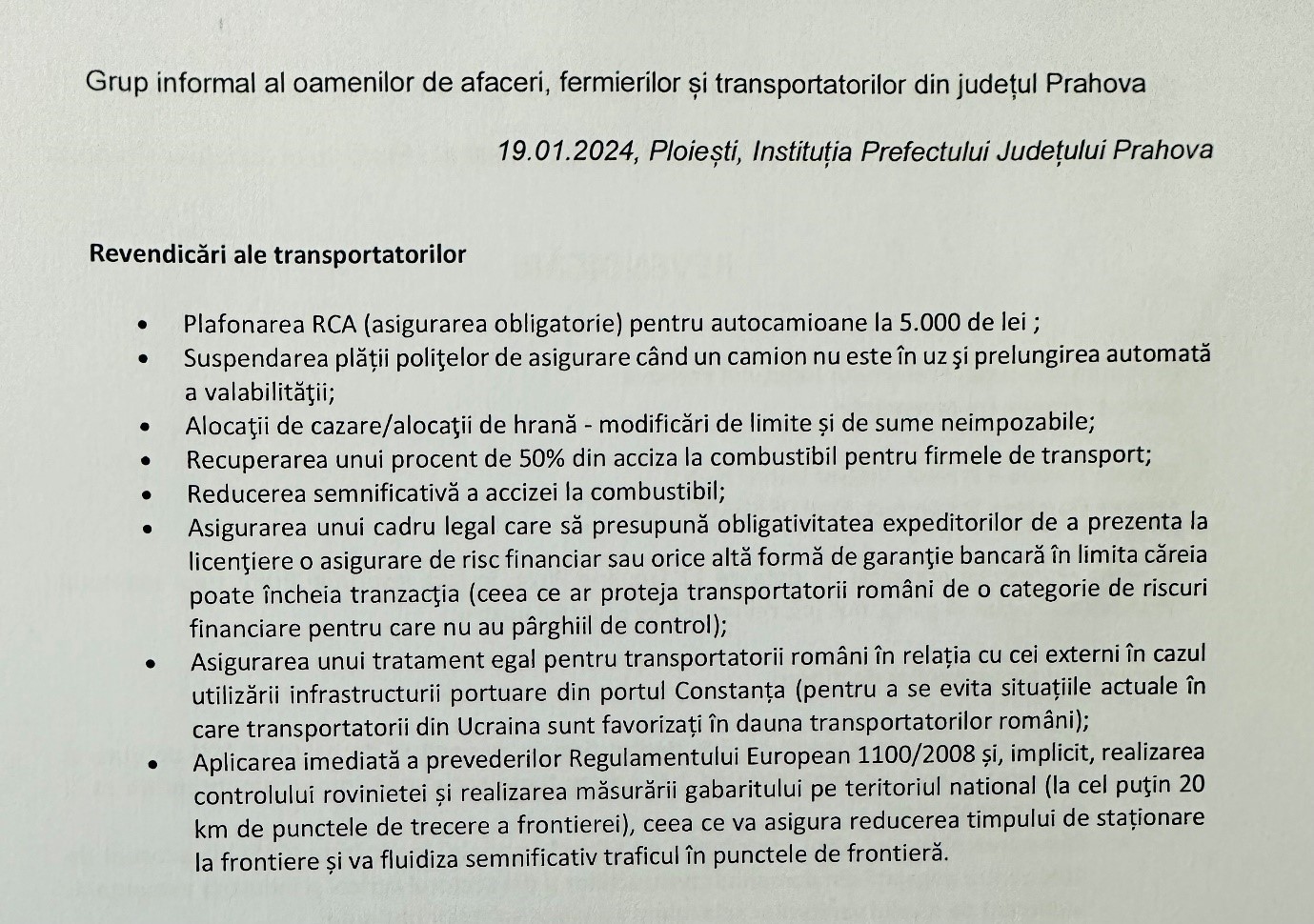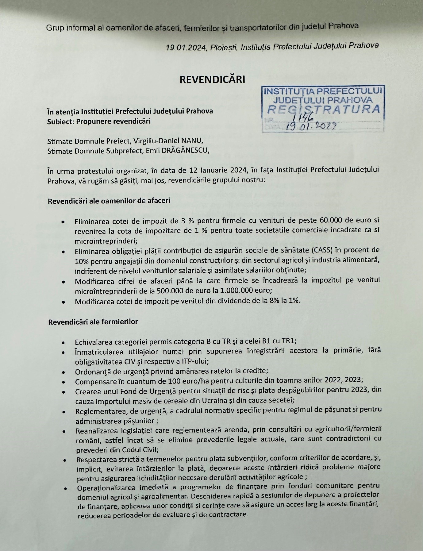Au fost prezentate, pe rând, toate revendicările grupului reprezentativ al oamenilor de afaceri, transportatorilor și fermierilor din Prahova, dezbătute și înregistrate la Instituția Prefectului Județului Prahova. S-a decis, de comun acord, ca Prefectura Prahova să trimită, pe canelele oficiale de comunicare, revendicările către Guvern și să transmită grupului confirmare oficială a trimiterii propunerii de revendicări către Guvern. S-a mai decis transmiterea oficială a răspunsului Guvernului, către grup, prin intermediul Prefecturii Prahova dar și pe adresa de e-mail a grupului, adresă de e-mail comunicată subprefecților.